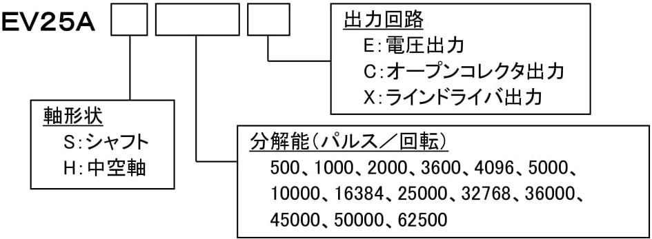 | 出力回路 | 電圧出力(E) NPNオープンコレクタ出力(C) ラインドライバ出力(X) |